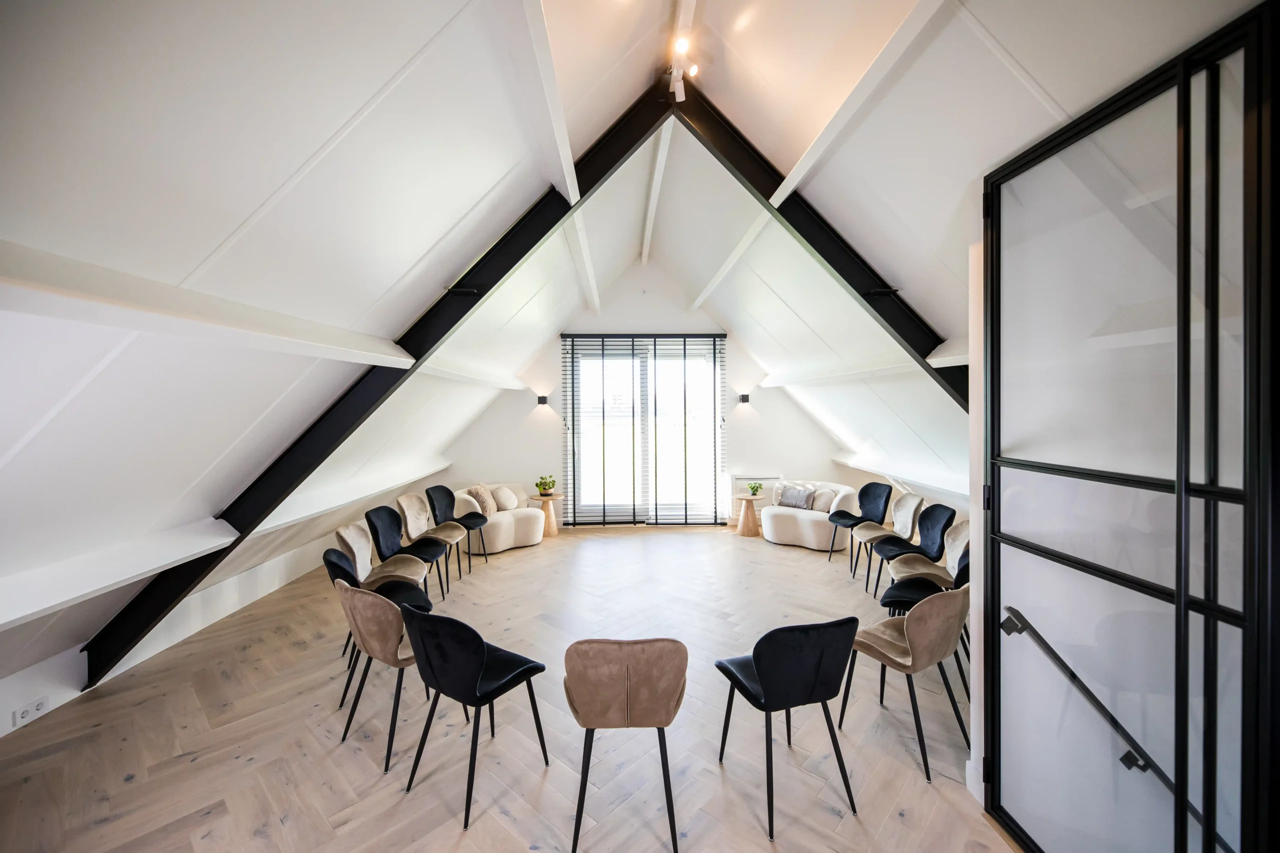 Jouw Verdieping is dé plek voor trainingen, zakelijke bijeenkomsten, heidagen en brainstormsessies, met een rustige en inspirerende landelijke sfeer. De ruimte is volledig uitgerust met een interactief scherm, professioneel koffiezetapparaat, aircosysteem, een eigen keuken en een luxe badkamer. Een privé tuin en landelijk uitzicht maken het de ideale omgeving voor creatieve sessies en ontspanning. Op vijf minuten afstand liggen de Bakkeveense Duinen, perfect voor wandelingen, sport of teambuilding. De locatie biedt flexibiliteit voor verschillende opstellingen en activiteiten, waardoor het leren, samenwerken en groeien stimuleert. Trainers, teams en organisaties vinden hier alles wat ze nodig hebben om hun doelen te bereiken. Neem contact op om deze unieke plek te ervaren en ontdek hoe Jouw Verdieping jouw bijeenkomst naar een hoger niveau tilt.